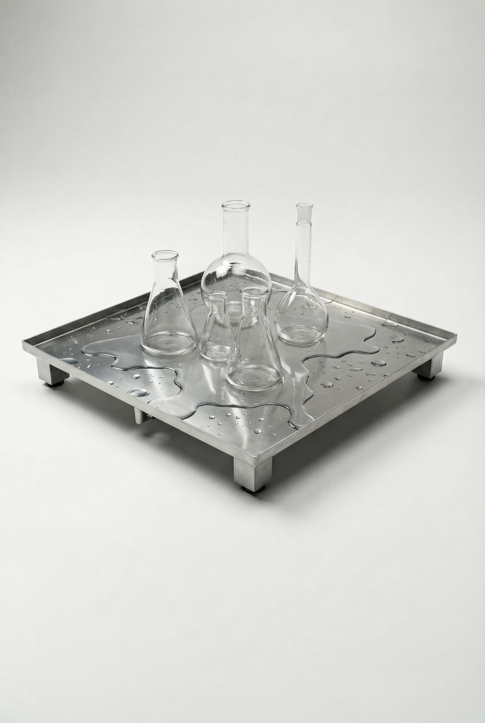 Столешница подставки выполнена в виде приёмного лотка, обеспечивающего сбор пролитой жидкости с дальнейшим сливом через дренажное отверстие. За счёт такой конструкции реализована возможность сбора пролитой воды или иной жидкости с дальнейшим сливом через сливной штуцер в накопительную ёмкость либо канализацию, что значительно упрощает работу с водой и водными растворами.